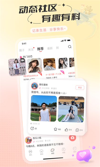 可以去各种聊天室和帅哥美女一起唱卡拉OK、玩游戏,不同风格的聊天室这里都有详细的区分,让自己更便捷的找到喜欢的需要,提供了十分多样化的选择,随时都能在这里得到最佳的结果。