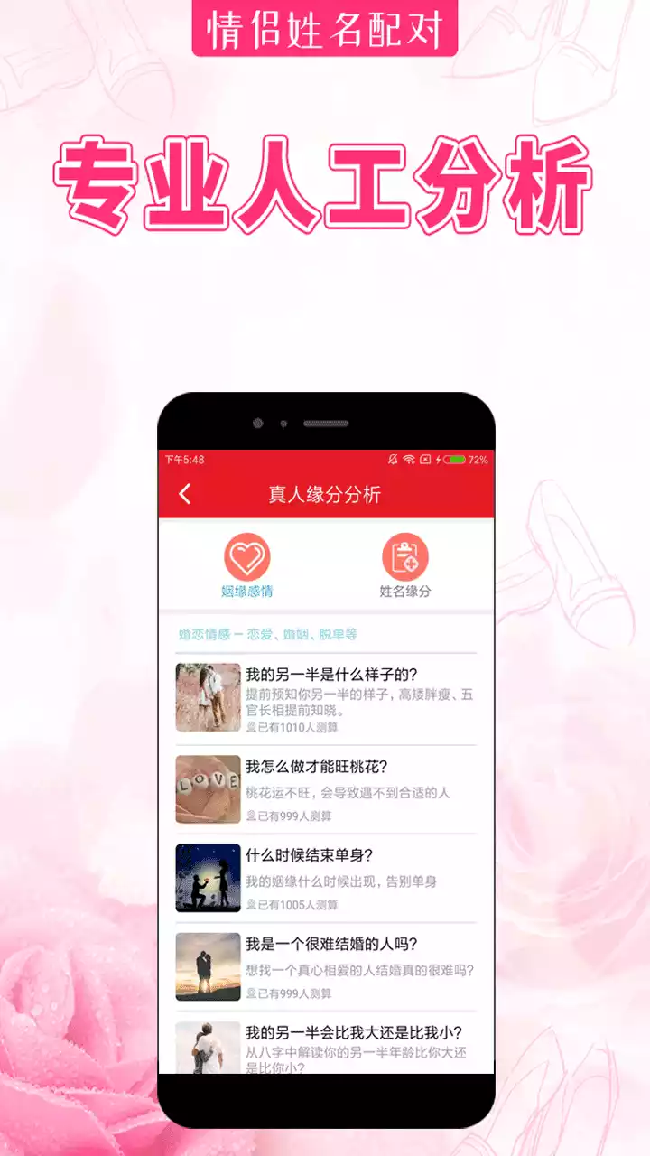 情侣姓名配对APP是一款融合情侣姓名配对、星座配对、生肖配对等等趣味的配对测算应用,是情侣速配缘分的实用工具,帮助你发现另一半的美好,分析情感问题,提高整体生活质量,赶快用它来测试测试你的另一半吧。