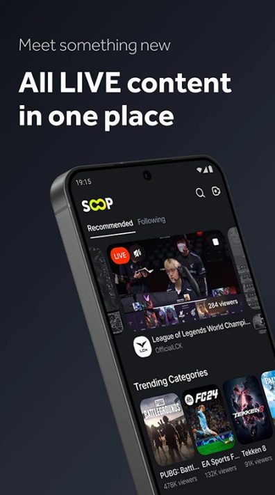 韩国soop直播软件安卓官方版原来叫 AfreecaTV,是个主打直播的综合平台,2024 年 10 月正式更名为 SOOP,并于 2024 年 11 月推出全球版服务。韩国soop国际版里面直播内容挺全的,游戏、娱乐、体育这些都有,尤其是英雄联盟玩家特别爱聚在这儿。除此之外,还有音乐直播、体育赛事直播之类的,不同人的观看需求基本都能满足。总的来说,游戏迷啊、体育迷啊,用这个平台还挺合适的。