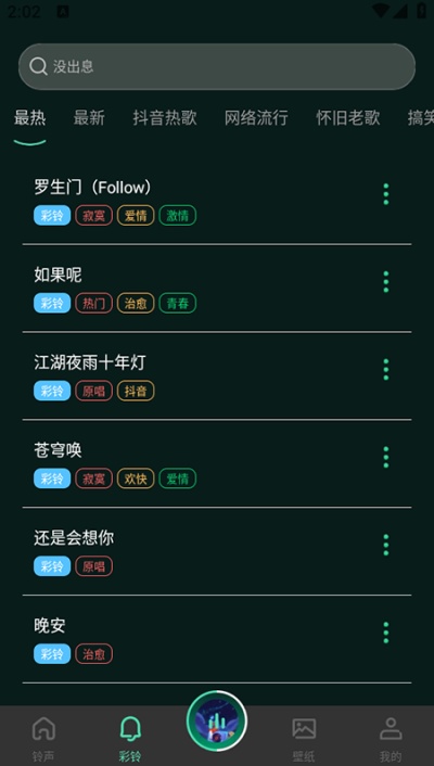 1、提供海量免费铃声资源,涵盖人气彩铃、抖音热歌、搞笑铃声、怀旧金曲等多个分类,支持搜索查找。