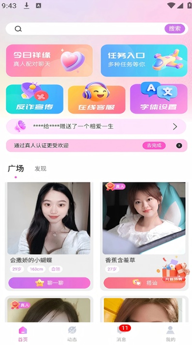 趣味互动玩法多:有专门的动态广场,用户能发布日常照片、文字记录生活,既能展示自己吸引同好,也能浏览他人动态找聊天话题;还能给心动对象赠送精美礼物表达心意。