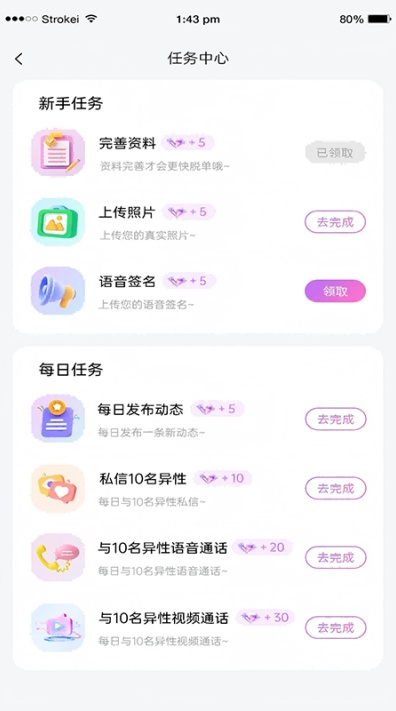 和对方沟通时,自由选择文字、语音或视频模式,日常也能完成每日任务领积分;