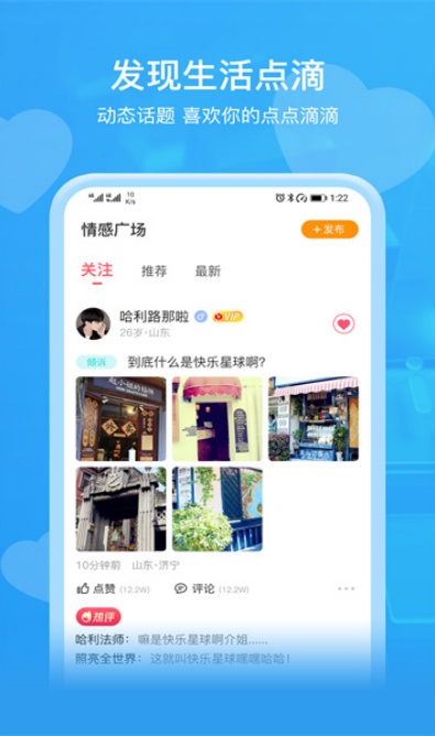 1、即见交友软件安卓官方版手机上就能用,能碰到好多志同道合的小伙伴。用户可在广场发布生活动态,也能浏览他人分享,通过点赞互动拉近距离。