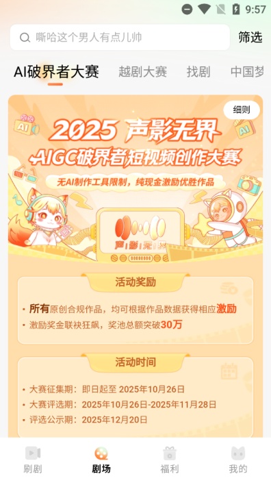 3、此外,APP 内还会上线 AI 破界者大赛这类活动,用户可报名参与,了解活动规则后准备作品参赛,有机会获得额外奖励和制作资源扶持。