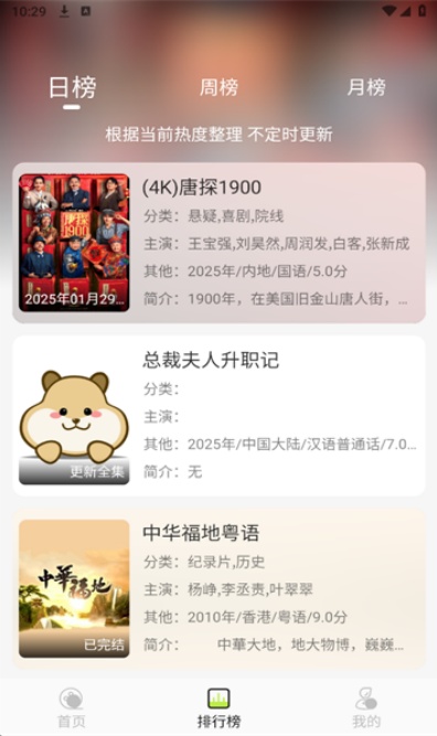 2、每天都会动态更新影视内容,热门剧集、院线新片基本能跟官方同步上线,用户不用长时间等待就能追更,还会实时更新影视榜单,方便掌握最新观影风向。