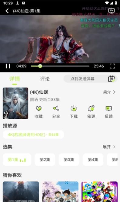2、除此之外,还能下载影片离线看,要是某条片源卡了还能换源,也支持开弹幕、调倍速,喜欢的片子还能收藏起来,功能还挺全乎的~