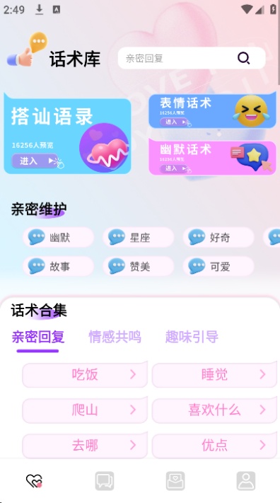 2、像大部分常用话术、表情包以及情感干货等基础内容都能免费使用查;