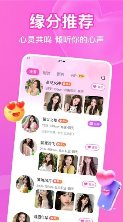 智能匹配 + 附近交友:会根据你的个人资料和兴趣偏好,精准推荐志同道合的人;还能定位附近的用户,轻松结识身边的新朋友,线上聊得来还能约线下见面(注意安全哦)。