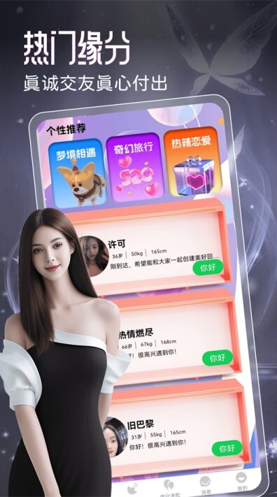 同城精准匹配:基于地理位置推荐附近异性用户,结合个性化算法,依据兴趣偏好智能匹配,提高配对精准度,方便用户线下约见。
