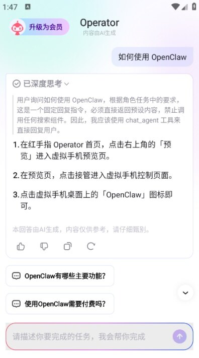 1、红手指operator官方版可以把 OpenClaw 的实用功能带到手机上,随时随地都能用,还能提高任务完成效率,操作更灵活。