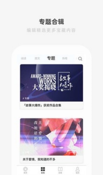 开设图文、阅读、专栏、连载、问答、音乐、影视、专题等多个板块,兼顾文学性与故事性,囊括青春、情感、家庭、都市、悬疑、科幻各种类型。
