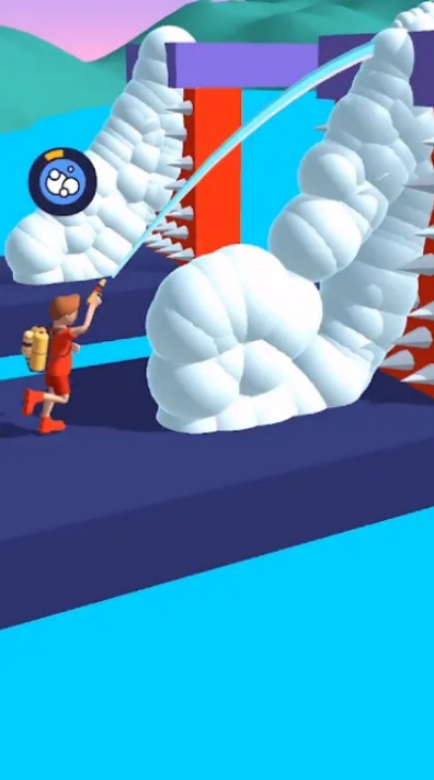 1、游戏里玩家要操控角色,拿着泡沫枪喷射出泡沫,通过泡沫堆积形成桥梁和斜坡,帮助角色越过各种障碍物和陷阱,不断向山顶攀登。