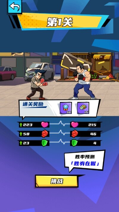 战斗流程:与其他拳手对战,操作以点击、滑动为主,可释放直拳、勾拳、闪避等动作,找准时机连击或 KO 对手。战斗胜利可解锁新技能、装备(如铁链拳套、铁甲臂),提升攻防能力。