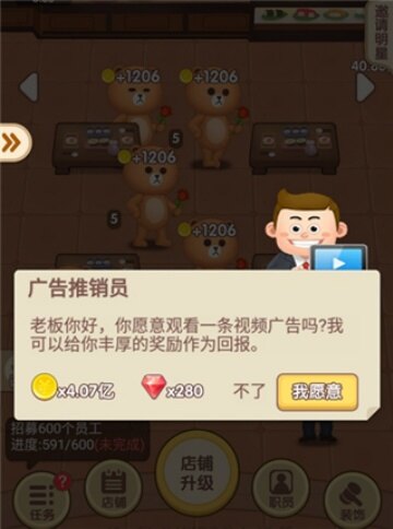 偶尔会遇到一些广告推销员,要求玩家观看一条视频广告,玩家统一观看后会获得金币和钻石的奖励