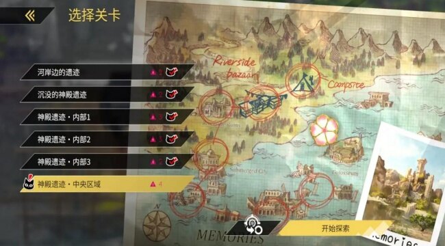 2、跟随着这条主线,玩家将前往大地图上的不同区域展开冒险(每个区域相当于一个章节,对应不同的探索区域,解锁后可随意切换,即能够游玩之前打过的关卡)。