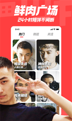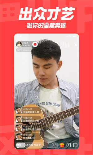 2、互动直播:男神主播24hr在线,心事交流、游戏开黑、才艺表演。